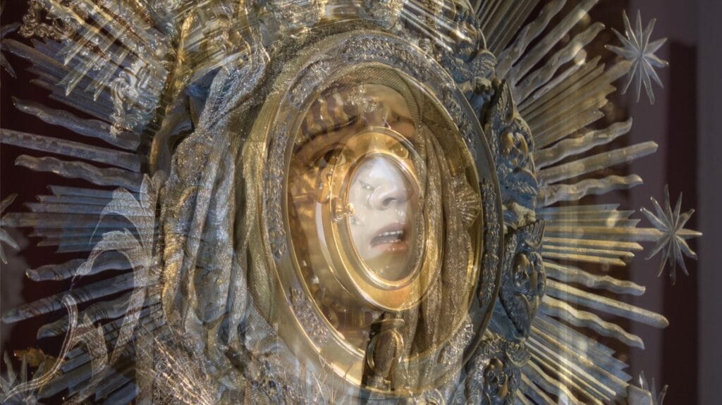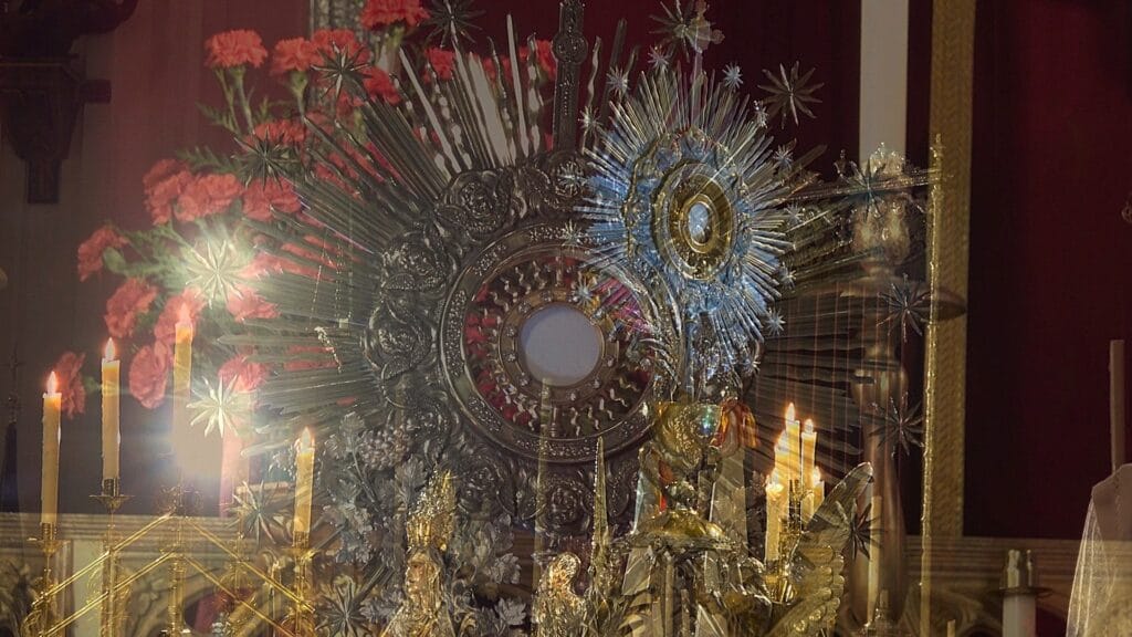 Comenzamos con una procesión de entrada desde el número 10 de la calle Guzmán el Bueno (San José de la Montaña) hasta la Parroquia, para continuar con una misa con rezo de Vísperas. Además, durante la ceremonia se impusieron las insignias de Adorador Nocturno a 5 nuevos aspirantes. Tras la misa se llevó a cabo la exposición del Santísimo y estuvimos adorando de 00:00 – 6:00 (6 turnos de vela de 1h), resultando así una Vigilia de noche completa, siguiendo el ejemplo de las primeras Vigilias realizadas en Sevilla a finales del siglo XIX. Entre turnos de vela se dispuso de un ágape fraterno – con las aportaciones de todos los participantes – en las dependencias de la Parroquia, donde disfrutamos de un agradable momento de convivencia.